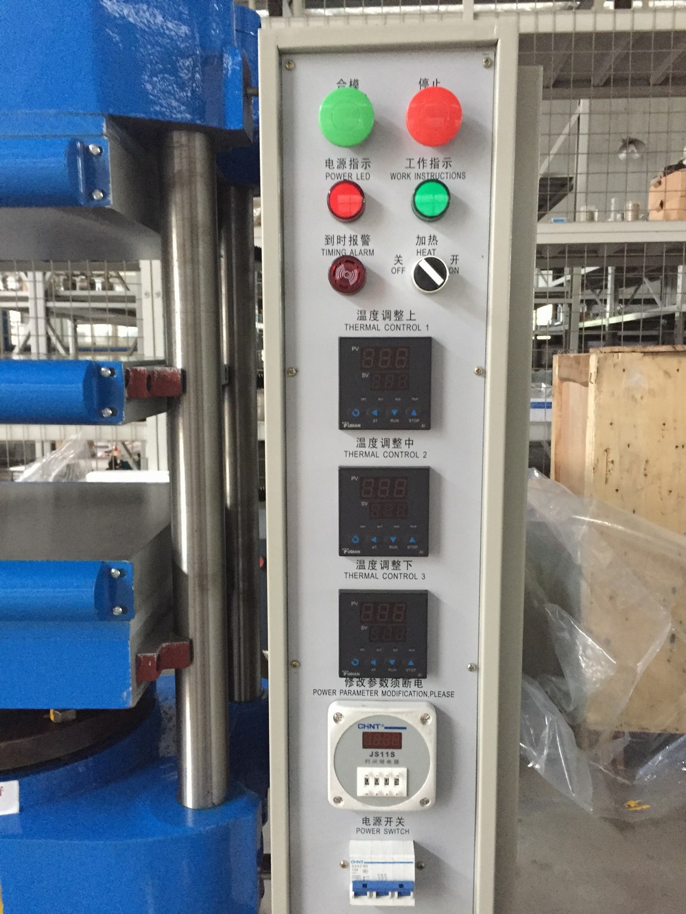 平板硫化機主要由主機、液壓系統(tǒng)、電控系統(tǒng)三大部分組成,油箱單獨安裝在主機左側(cè),不受熱板溫度的影響;操作閥安裝在主機左側(cè),工人操作方便、視覺寬敞;電控箱另行安裝于主機之右側(cè)。