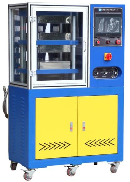 原料放于鑄模內(nèi),夾于本機(jī)電熱平板間加以壓力及溫度,使原料成型,以供試驗(yàn),做為工廠大量生產(chǎn)配料之依據(jù)。本機(jī)裝有 PLC 程序控制彩色觸摸屏,人機(jī)界面作業(yè)系統(tǒng)可設(shè)定壓力、溫度、時(shí)間和排氣次數(shù),硫化過程即時(shí)顯示和監(jiān)視,所設(shè)模壓程序全數(shù)自動完成。